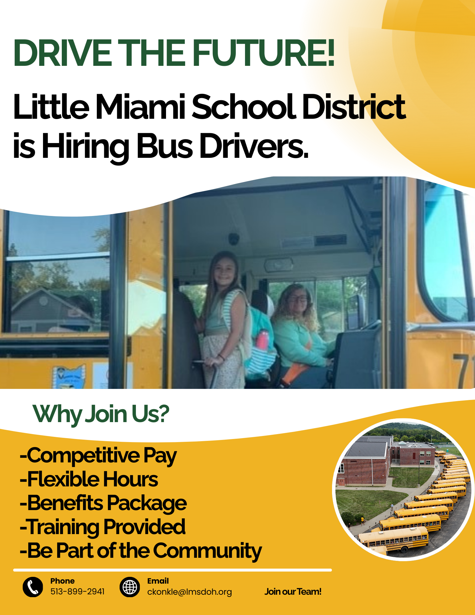 Little Miami Local Schools is hiring school bus drivers. Bus drivers have an important role as they ensure safe transport and often make the first & last impressions of the school day. Class B CDL with passenger and school bus endorsements is preferred. Why drive for Little Miami? • Competitive Pay • Great Benefits • Open Routes Available • Start Immediately • Off on weekends • Off for school holidays • Field trips to make extra money