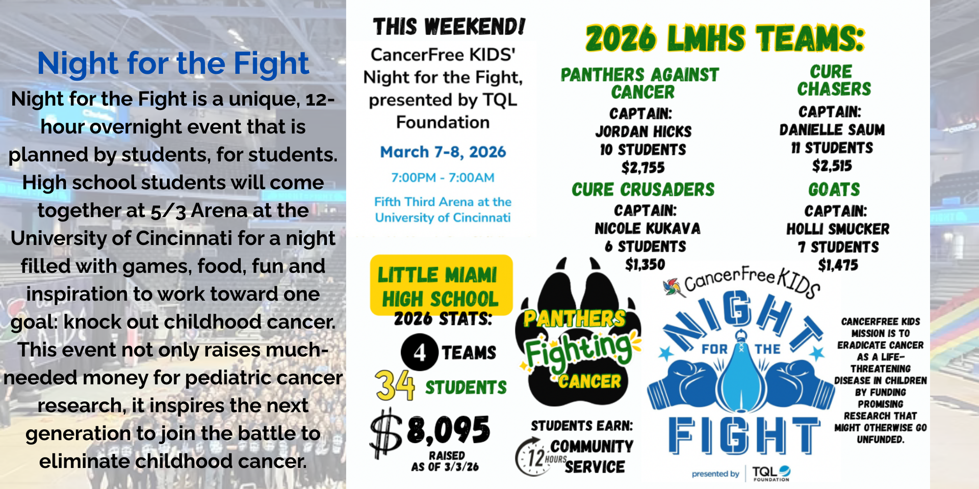Night for the Fight is a unique, 12-hour overnight event that is planned by students, for students. High school students will come together at 5/3 Arena at the University of Cincinnati for a night filled with games, food, fun and inspiration to work toward one goal: knock out childhood cancer. This event not only raises much-needed money for pediatric cancer research, it inspires the next generation to join the battle to eliminate childhood cancer.